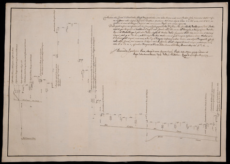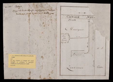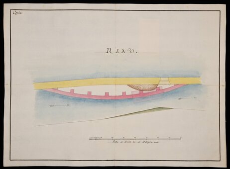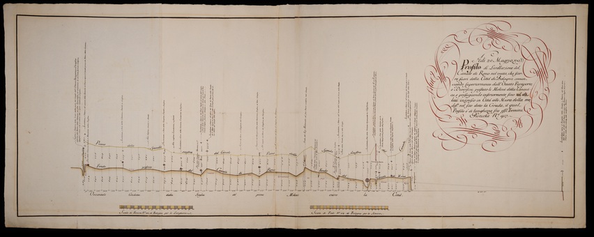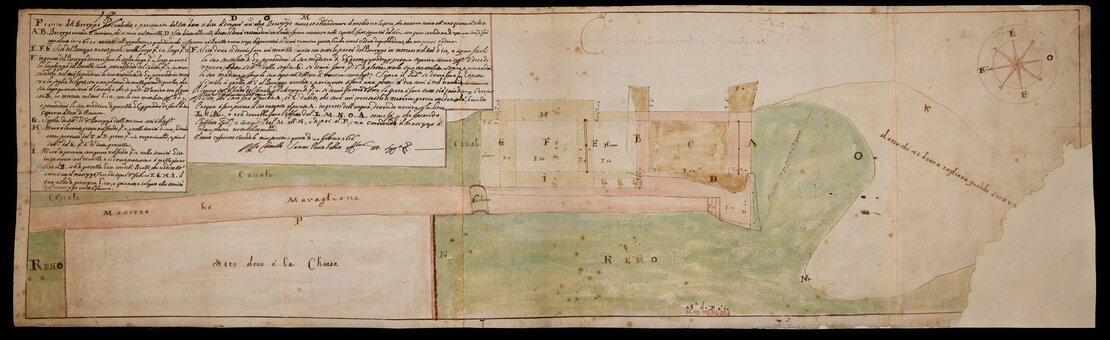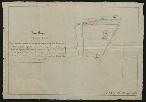 Descrizione: Governo Pontificio. Bologna, li 5 marzo 1835. Pianta dimostrativa il perimetro dell'orto irrigatorio di ragione del signor Pietro Zaniboni, posto in Bologna, che fluisce l'acqua dal Canale di Reno col mezzo della ruota ... sottoposta all'edificio dell'Assunteria della Chiusa di Casalecchio..