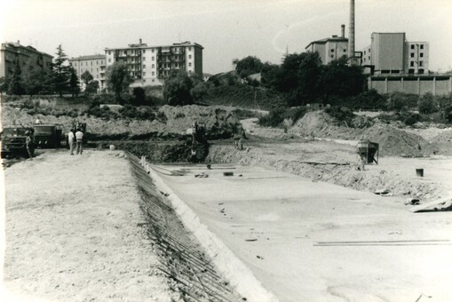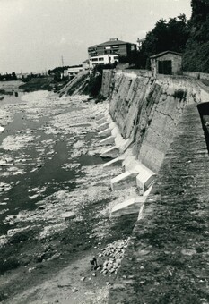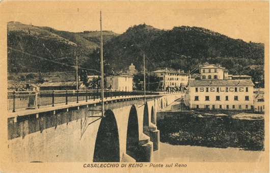 Descrizione: Veduta del ponte sul fiume Reno a Casalecchio. Sullo sfondo si nota lo stabilimento SELCE (Società Emiliana Lavorazione Cementi).